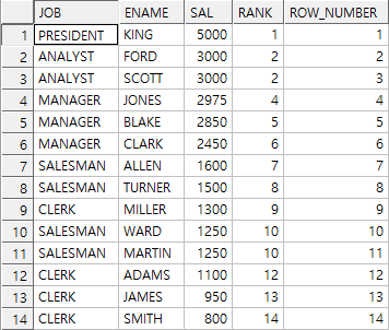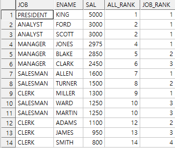 RANK() OVER (PARTITION BY JOB ORDER BY SAL DESC) JOB_RANK