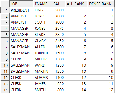 RANK() OVER (ORDER BY SAL DESC) ALL_RANK,