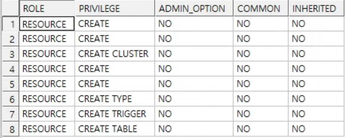 SELECT * FROM ROLE_SYS_PRIVS WHERE ROLE='RESOURCE';