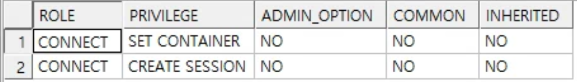 SELECT * FROM ROLE_SYS_PRIVS WHERE ROLE='CONNECT';